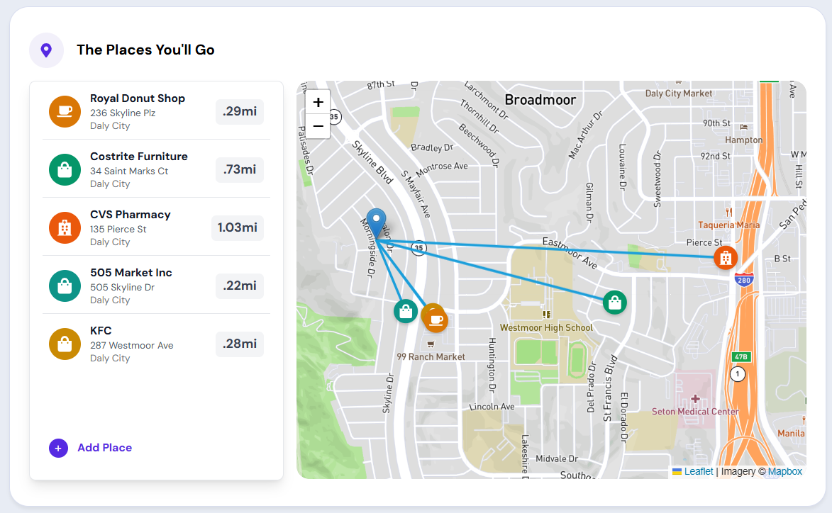 Interactive map displaying nearby everyday destinations—such as grocery stores, pharmacies, and restaurants—around a rental listing, with distances and visual routes to help renters evaluate location convenience.